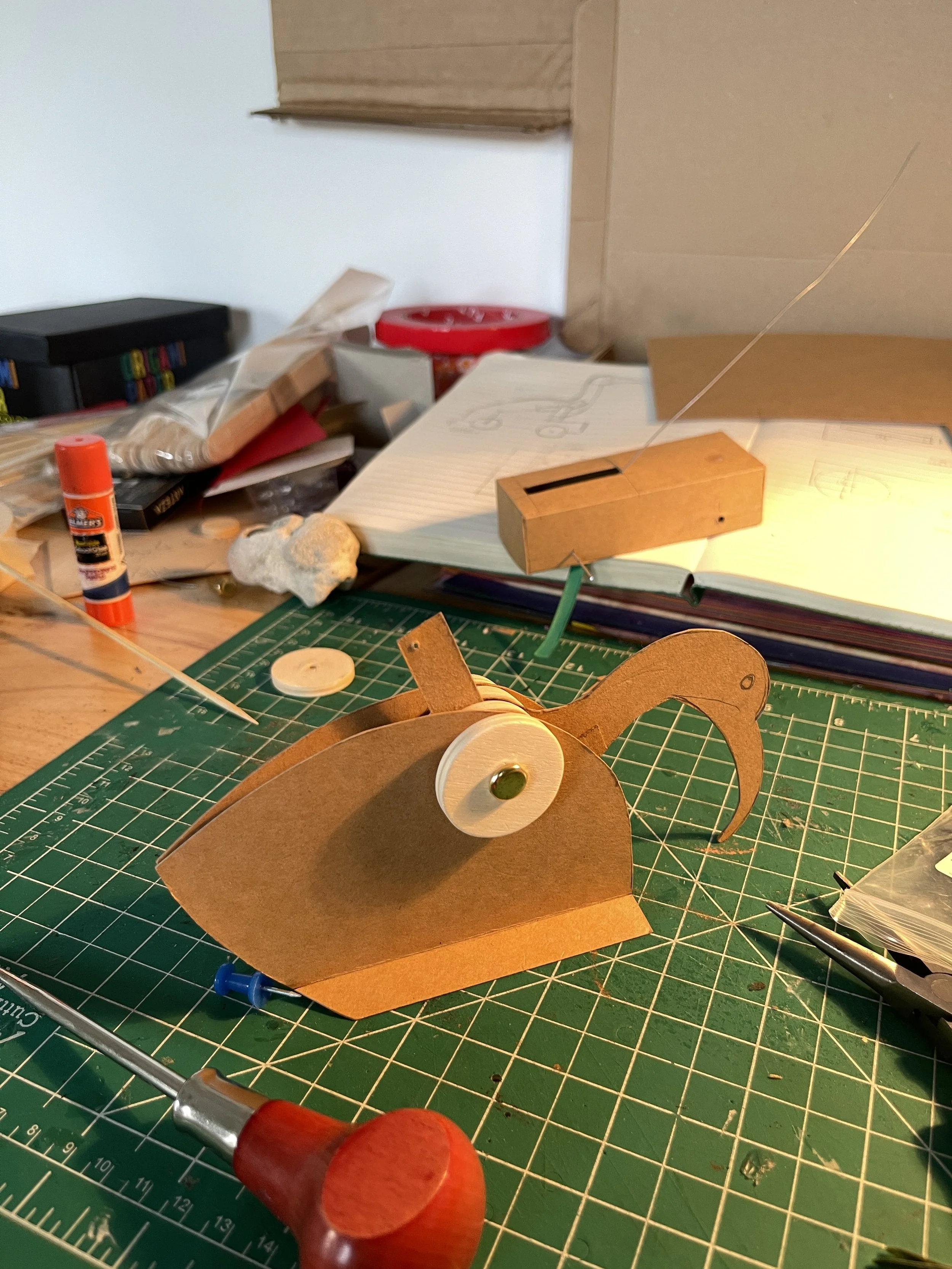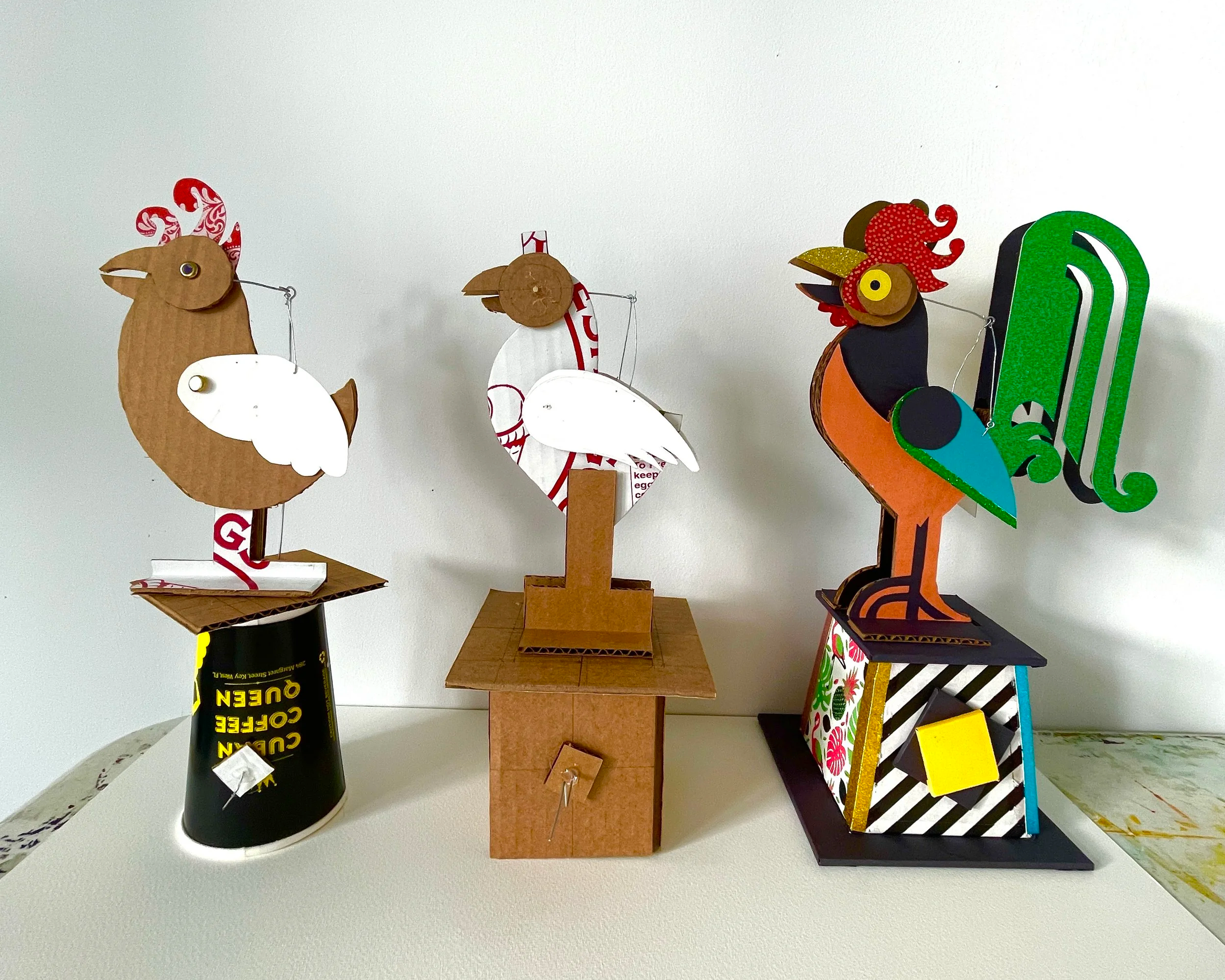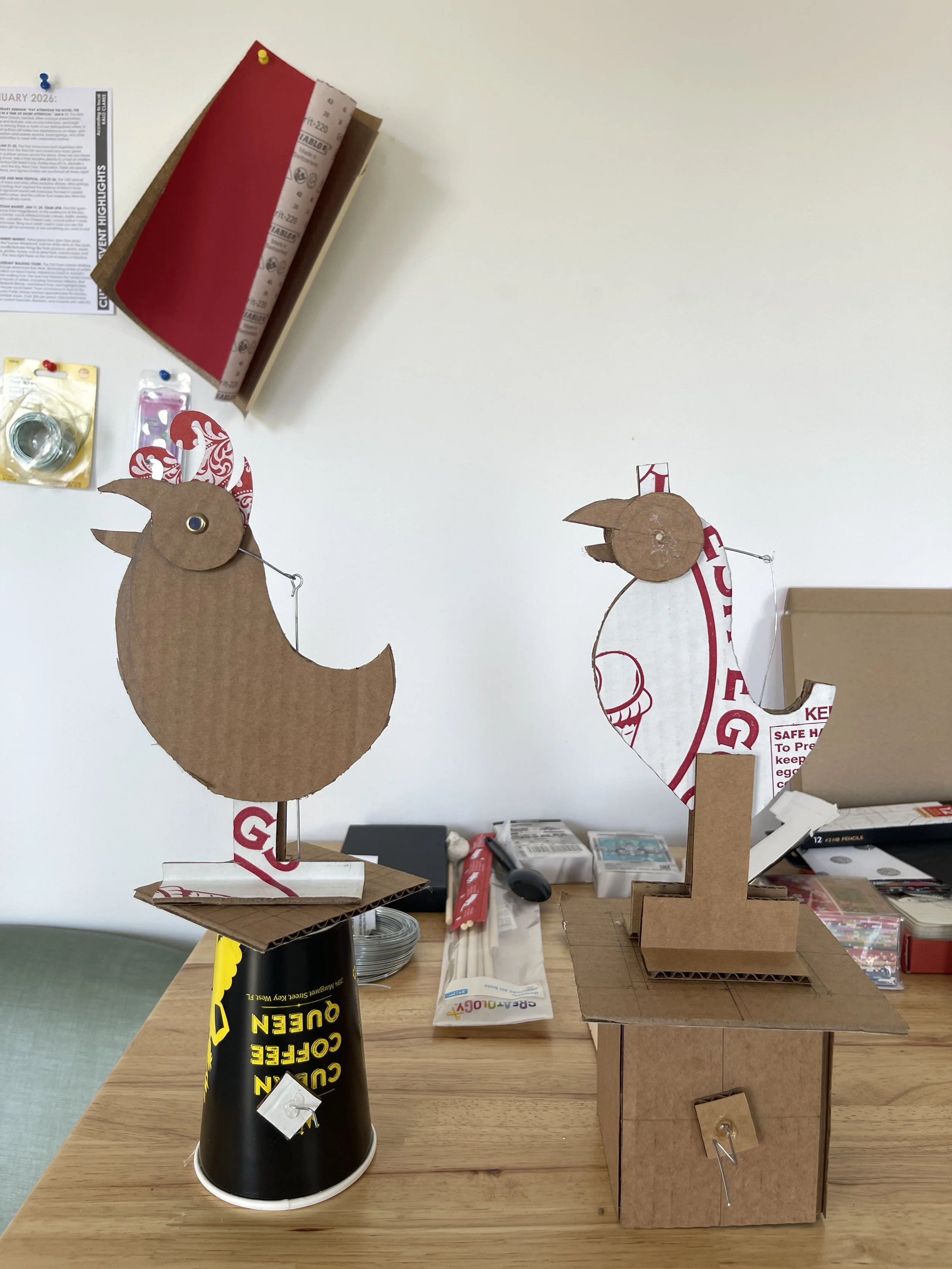 My time at Key West was specifically time to get away from screens and get back in touch with using my hands—sadly something I don’t have a lot of time to do. I had brought a few simple design tools: x-acto knife, an assortment of colored paper, compasses, etc. It was an opportunity for me to start work on a new, long-delayed direction in my research, that of making kinetic sculptures and automata. Using materials I was able to find in fishing tackle and hardware stores, and whatever else I could find on the street, I created a number of chicken-based prototypes (which I dubbed chic-o-mats) that I plan to re-build using more durable materials now that I’m back in Baltimore. You can see a sampling of the process and finals below!