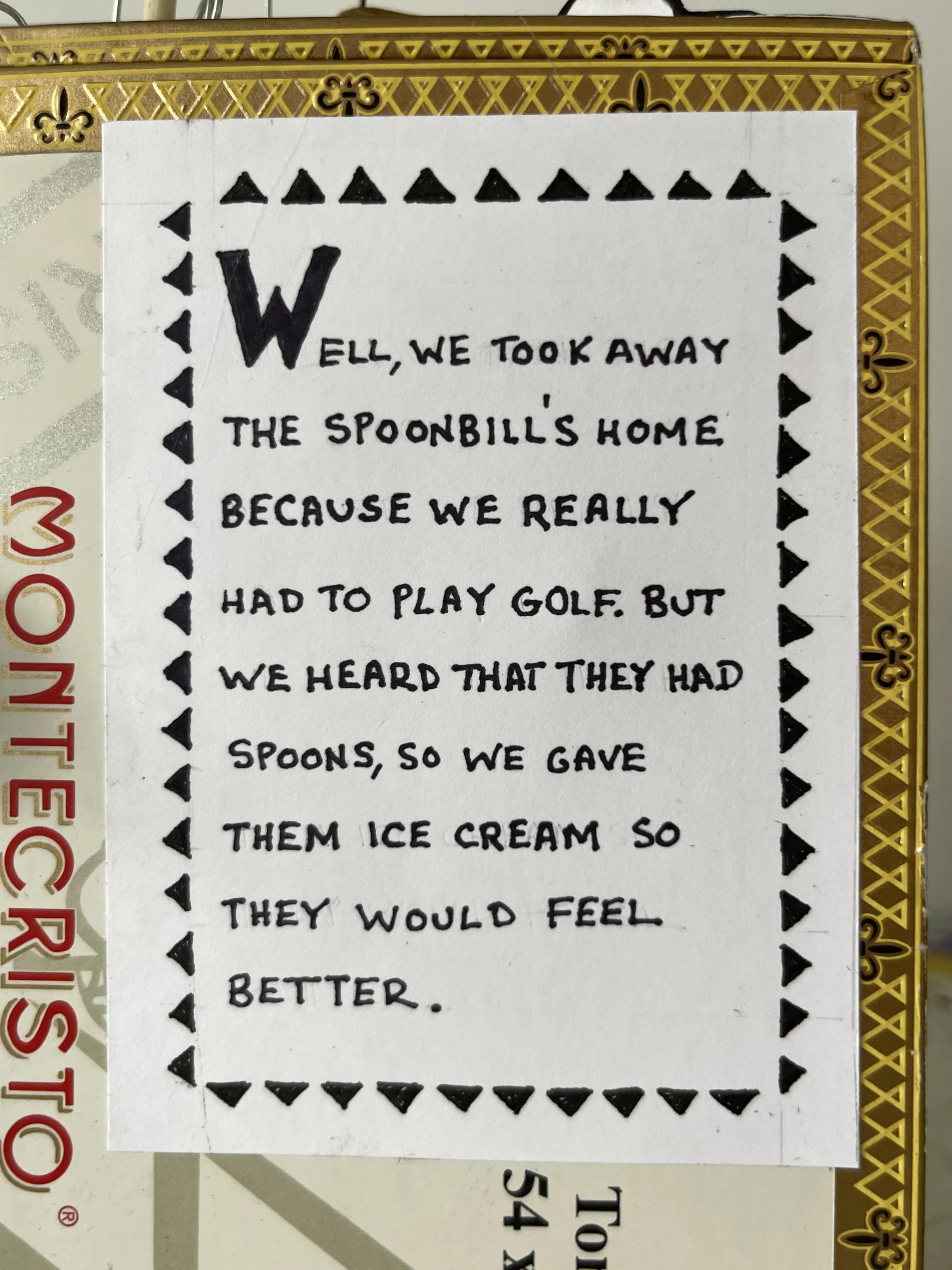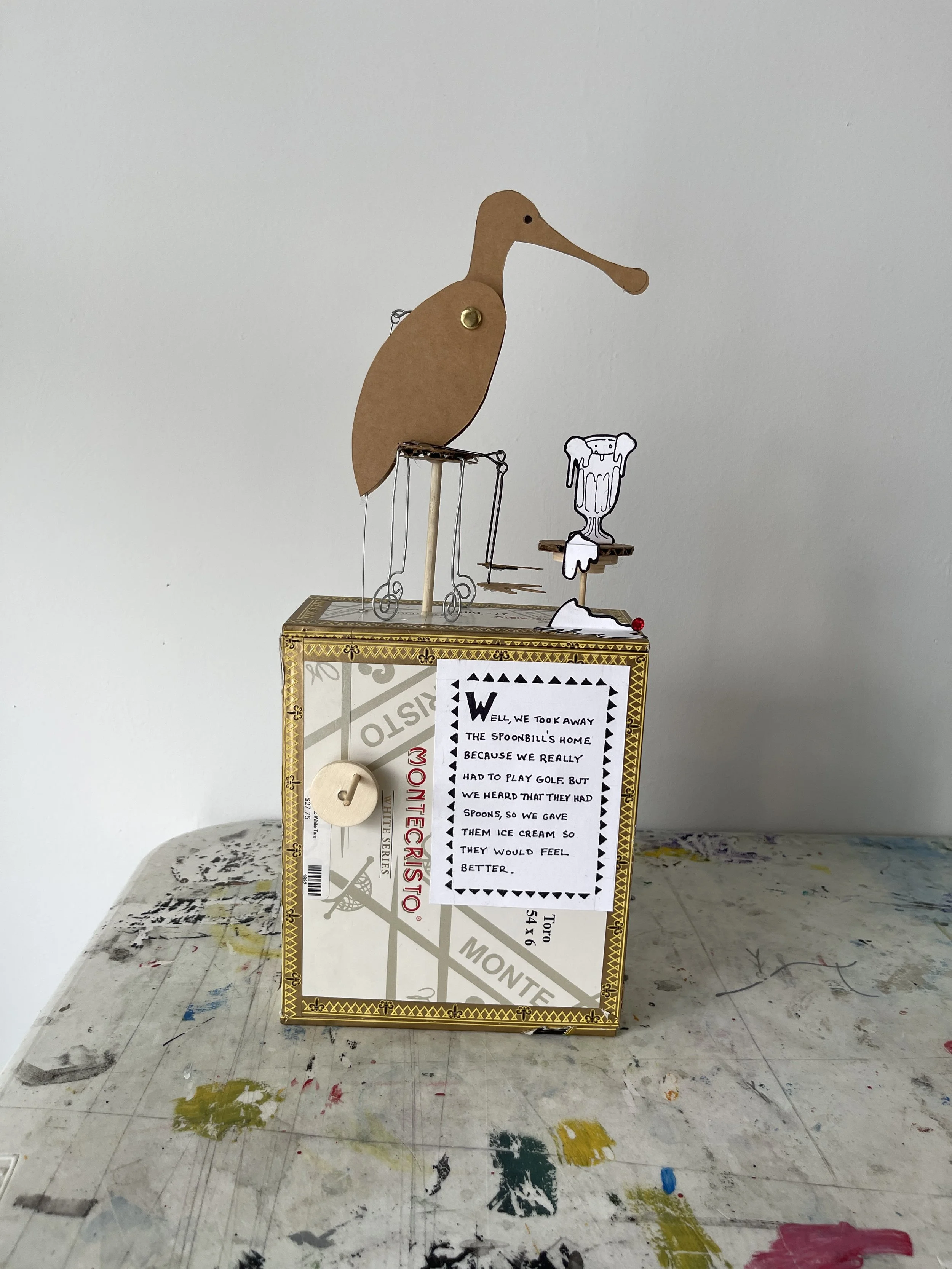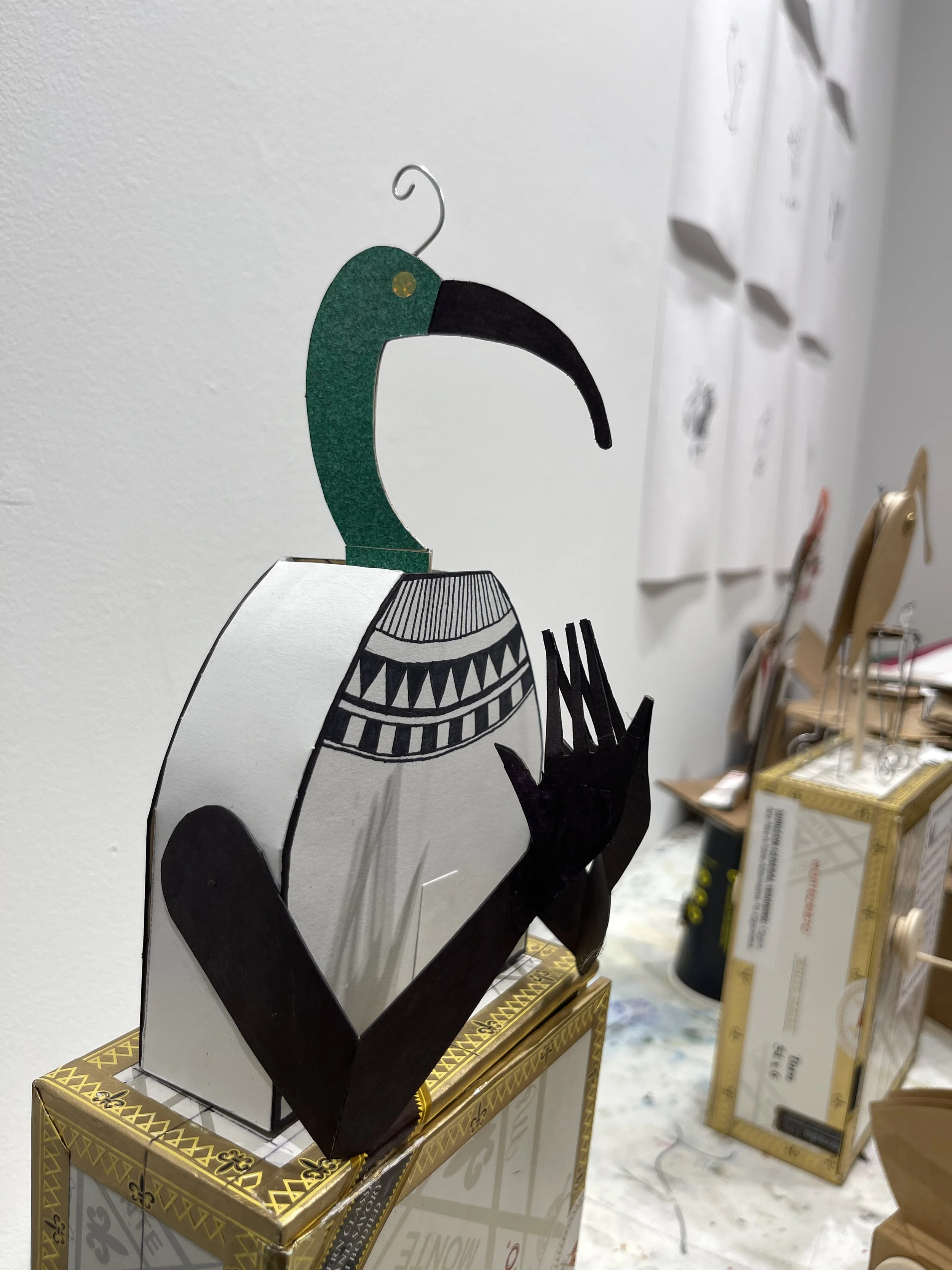 My time at Key West was specifically time to get away from screens and get back in touch with using my hands—sadly something I don’t have a lot of time to do. I had brought a few simple design tools: x-acto knife, an assortment of colored paper, compasses, etc. It was an opportunity for me to start work on a new, long-delayed direction in my research, that of making kinetic sculptures and automata. Using materials I was able to find in fishing tackle and hardware stores, and whatever else I could find on the street, I created a number of chicken-based prototypes (which I dubbed chic-o-mats) that I plan to re-build using more durable materials now that I’m back in Baltimore. You can see a sampling of the process and finals below!