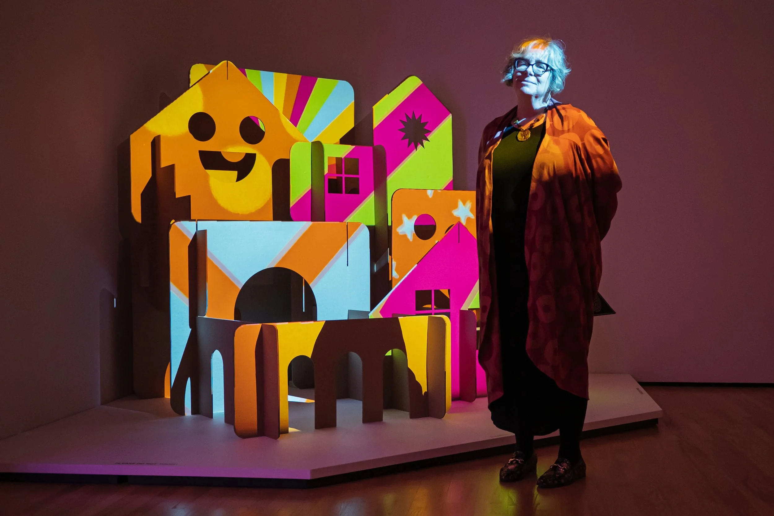The honorarium and opportunity to show at one of our city’s prestigious art museums spurred me to create my most ambitious work to date—Fantastic Village. Recalling the concrete geometries of Modernist / Brutalist playgrounds, Fantastic Village suggests communities are brilliant, ever-changing modular systems where we play out our lives. It pays tribute to the artist Virginia Dortch Dorazio’s 1953 award-winning playground design of the same name—recognized by the Museum of Modern Art and once a common feature in public parks nationwide. Though now demolished, her structures live on in Fantastic Village, which also evokes saltbox seaside homes, earthen tribal dwellings, and any place where people live and dream together. Colorful light plays across and through the faces of these structures as our collective hopes, disappointments, joys and sorrows play out publicly and privately in the places we live.