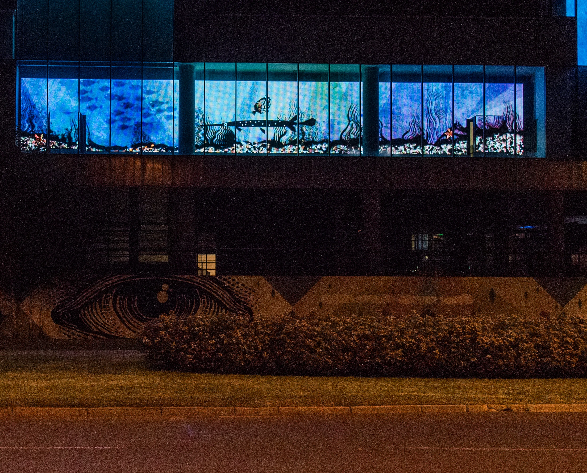 Viewers were invited to interact with Projected Aquaculture through printed and online resources, including a field guide and a Bay Bingo game and Field Guide where they could learn about the underwater flora and fauna featured in the projection.