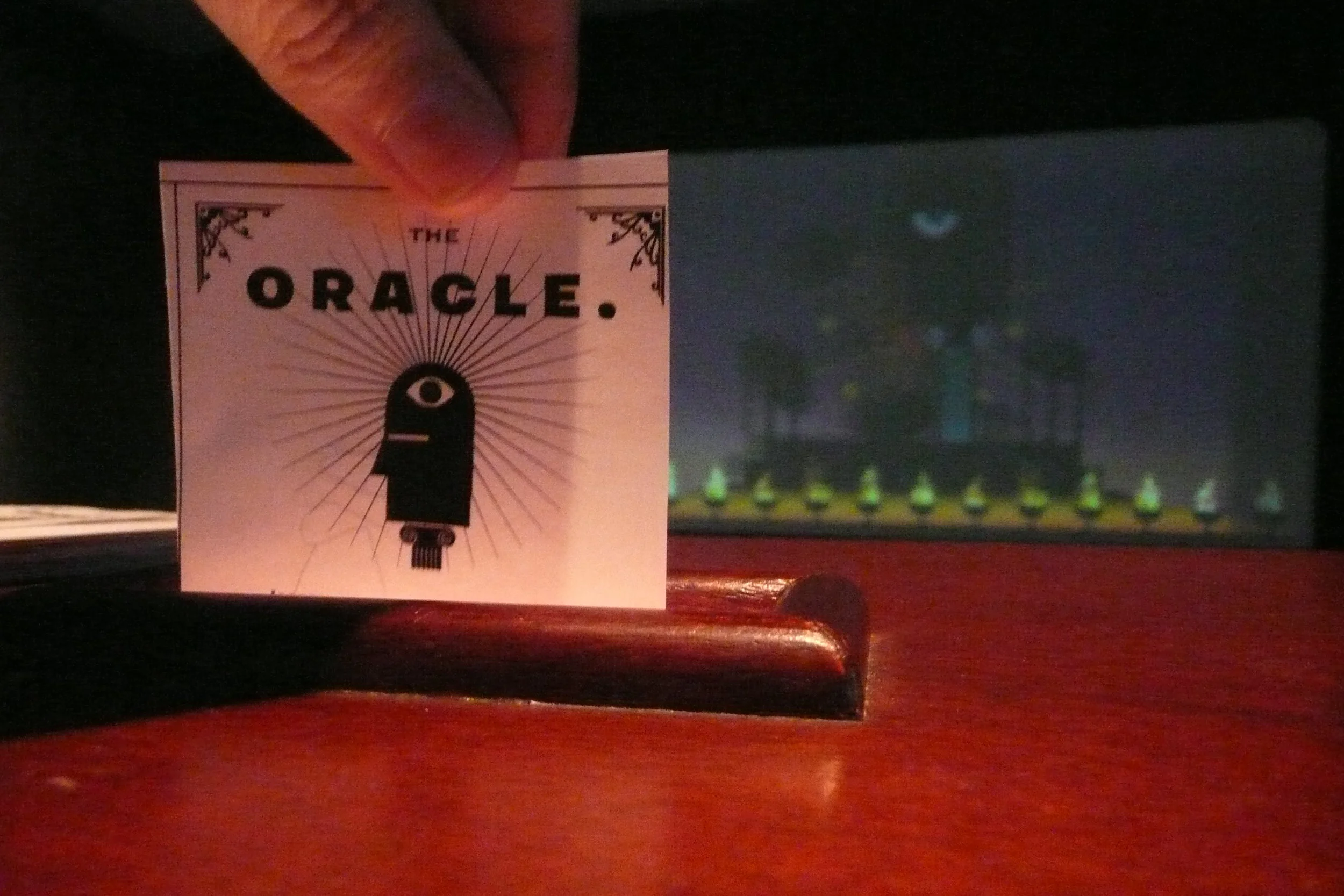 The installation combines animation, light sensors and a projector to create a fortune-telling machine that responds to queries submitted to it on small pieces of paper submitted by the viewer. It consists of the projected animation of the oracle, the projector itself, and a "petition box" containing a light sensor that triggers the answers to the solicited questions.