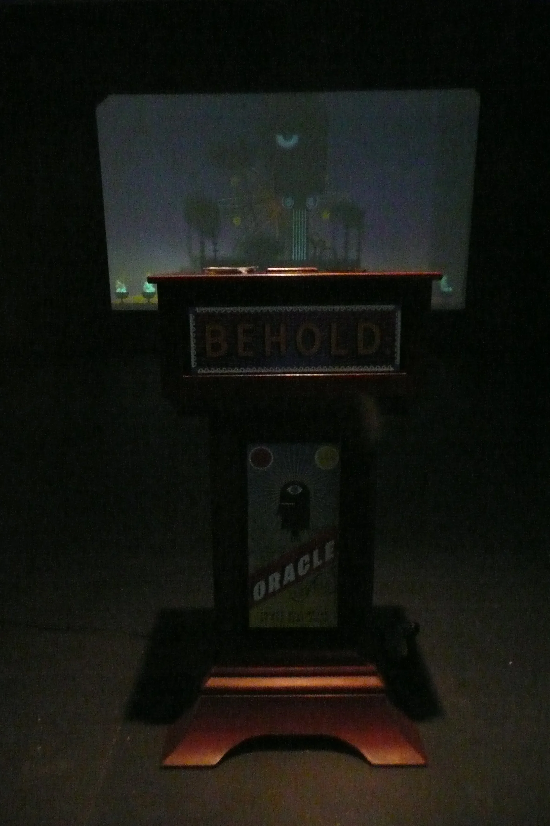The Oracle is an interactive video installation that celebrates (and lampoons) our faith in technology and it's seemingly endless progress towards a better future. The Oracle is a fantastic spectacle that provides answers to the user's fears and anxieties through the miracle of modern machinery.
