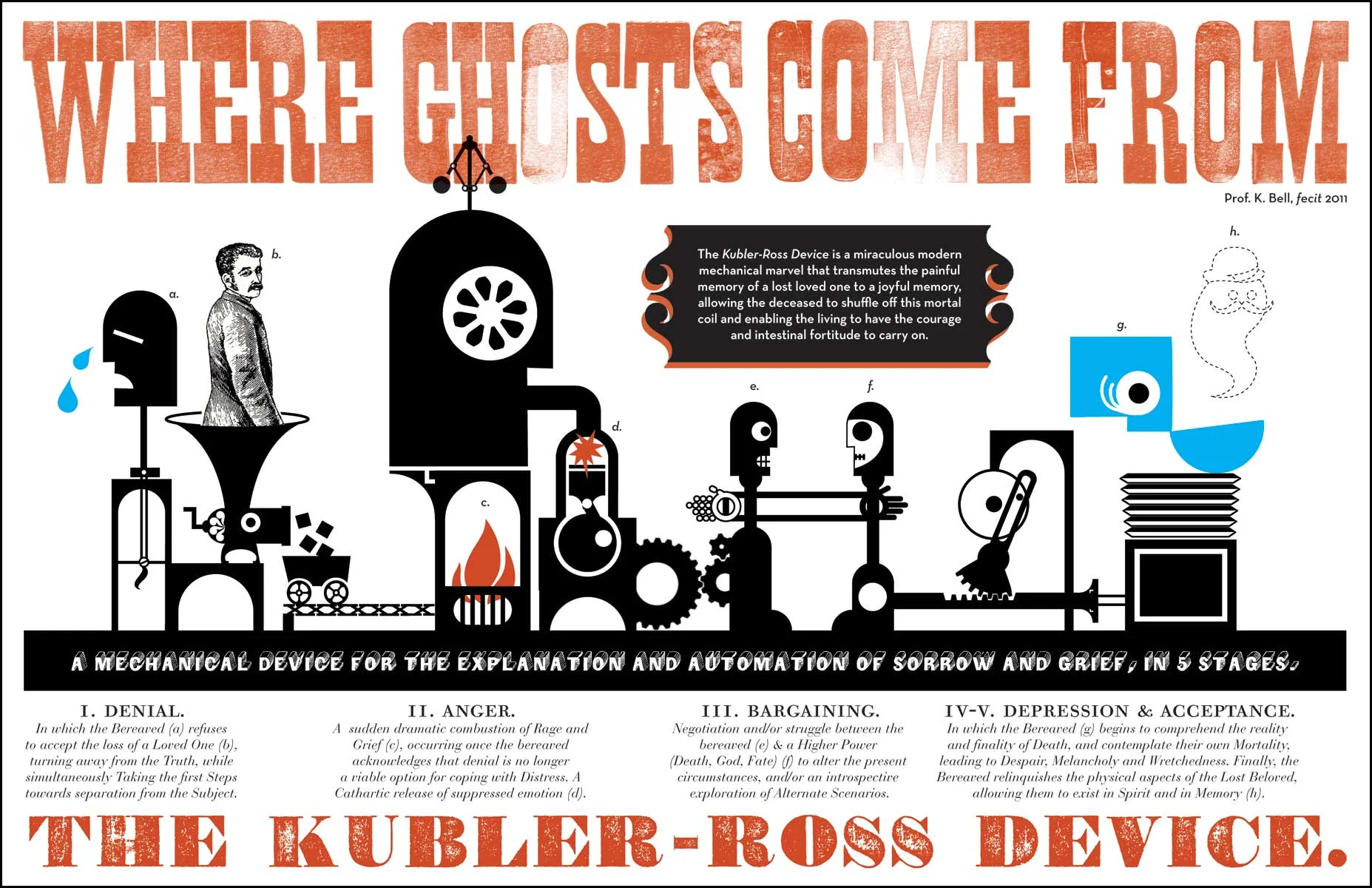 A video installation presenting an animated “device” explaining the Kubler-Ross Model, based on Elisabeth Kubler Rossʼs “Five Stages of Grief” in her book On Death and Dying. This device is a “miraculous modern mechanical marvel that transmutes the painful memory of a lost loved one to a joyful memory, allowing the deceased to shuffle off this mortal coil, and enabling the living to have the courage and intestinal fortitude to carry on.” The animation itself is presented as a sculptural piece within the gallery, as opposed to screened in a theater space before a seated audience.